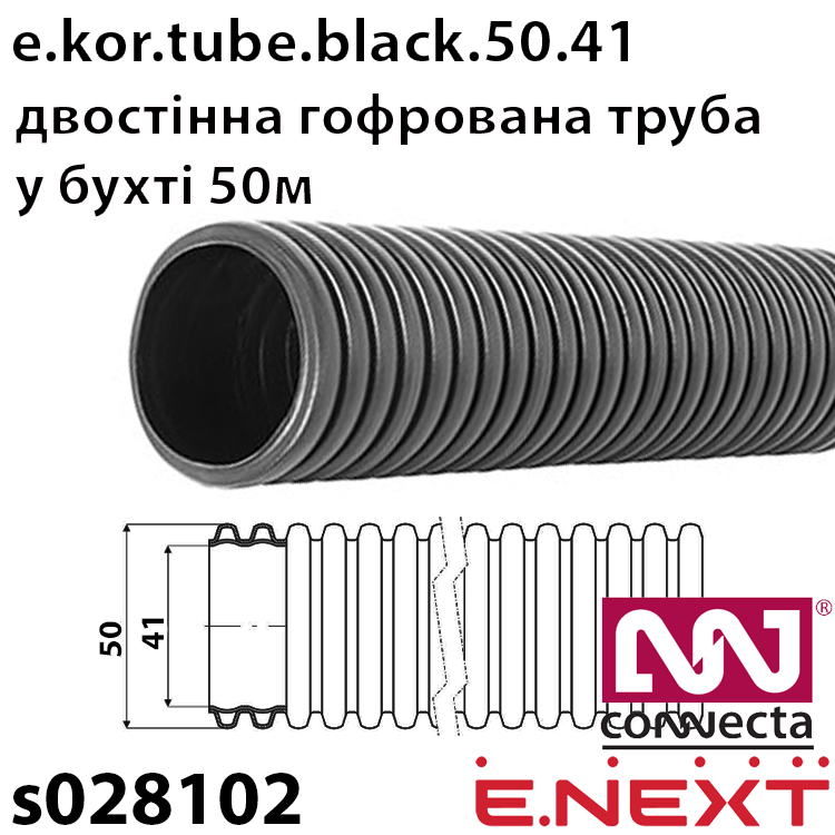 Характеристики Труба гофрована двостінна чорна ENEXT e.kor.tube.black.50.41, 50/41мм (50м)