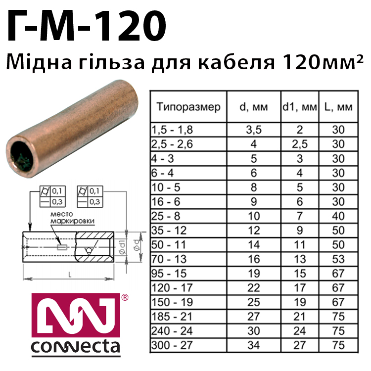 Характеристики Гільза мідна кабельна Г-М-120