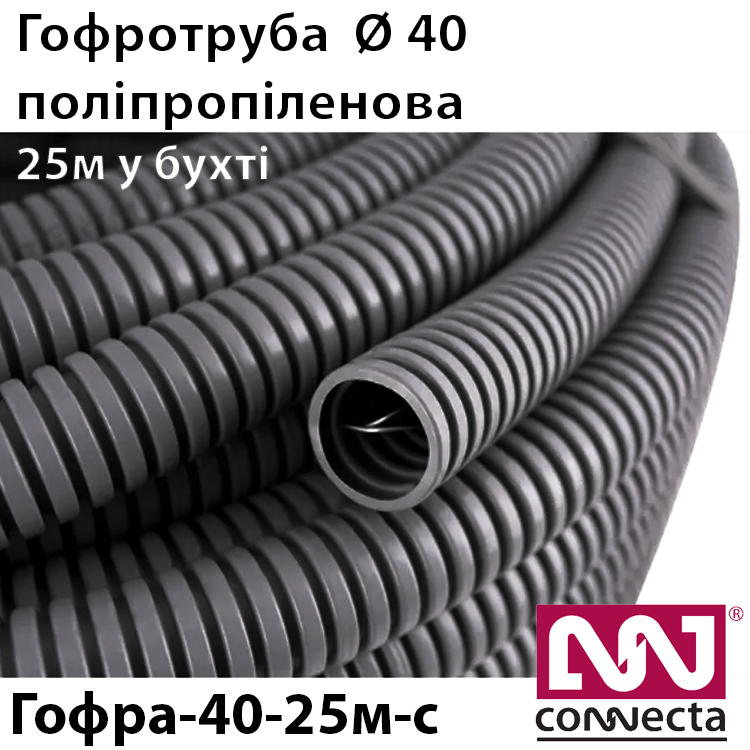 Характеристики Гофротруба УФ стійка поліпропіленова Ø 40мм / 25 метрів сіра