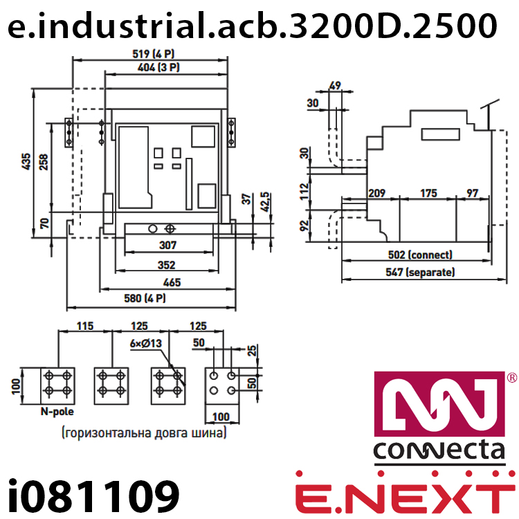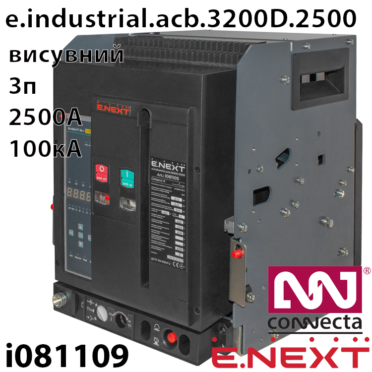 Характеристики Повітряний автоматичний вимикач e.industrial.acb.3200D2500, викатний, 0,4кВ, 3Р, електронний розчіплювач, мотор-привід та РН