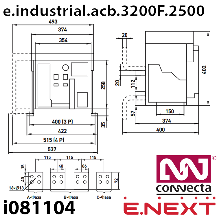 Характеристики Повітряний автоматичний вимикач E.NEXT e.industrial.acb.3200F.2500, стаціонарний, 0,4кВ, 3Р, електронний розчіплювач, мотор-привід та РН